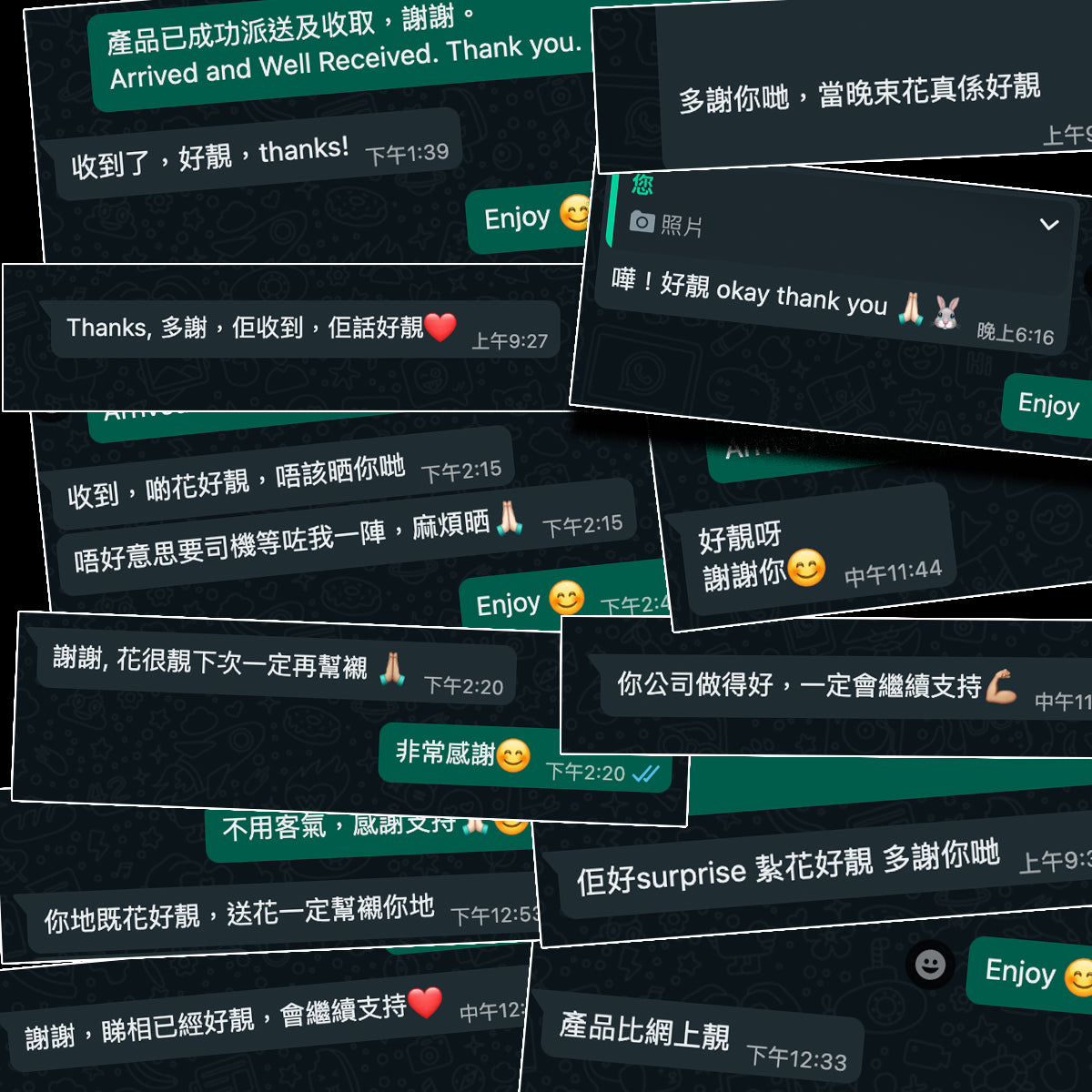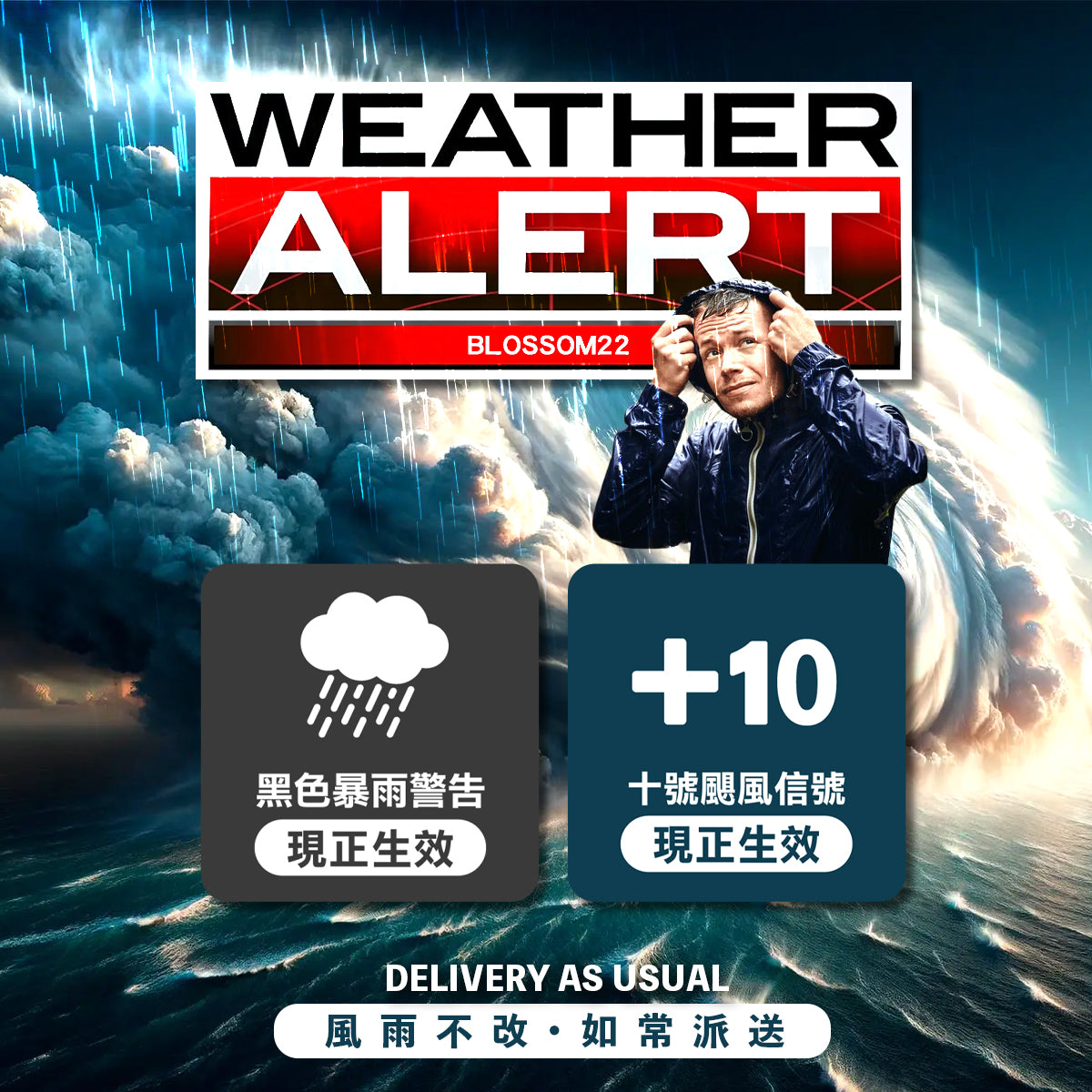 為免客戶錯過特別日子,本公司於「十號風球」或「紅黑雨」等天氣惡劣情況下,依然會為客戶如常派送。唯路面因水浸、封路、視野糢糊而行車緩慢等特別交通情況,致使派送時間或有所阻延,敬請包涵見諒。