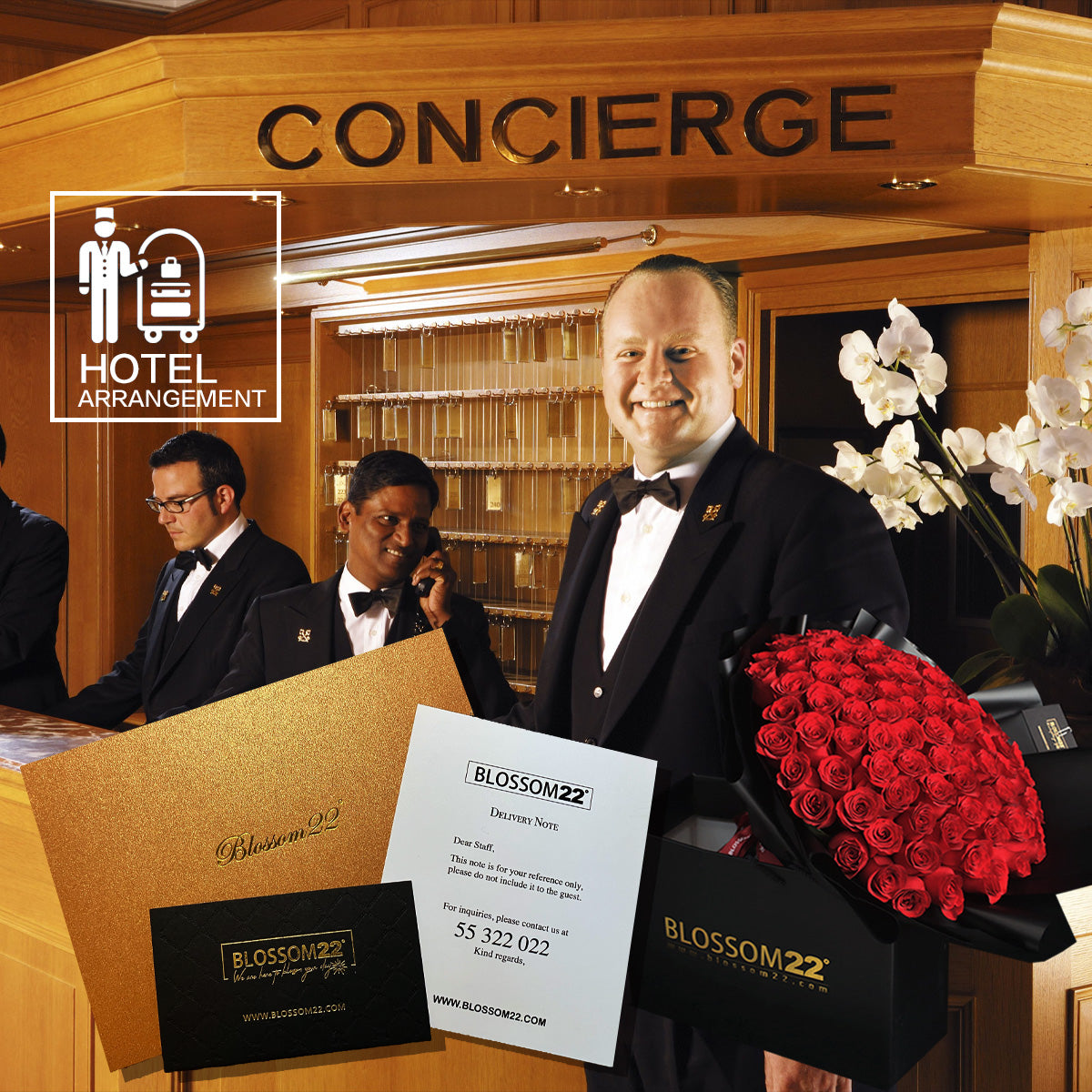 本店備有 Delivery Note 為你與酒店進行對接,花束一律直送禮賓部代收暫存,再行等候閣下指示。